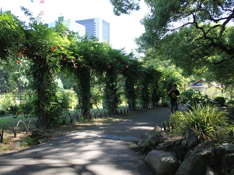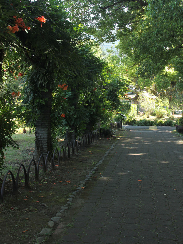 真夏の日差しが差し込む花壇を見ながら涼しい風が抜ける木陰の通路がとてもいい。