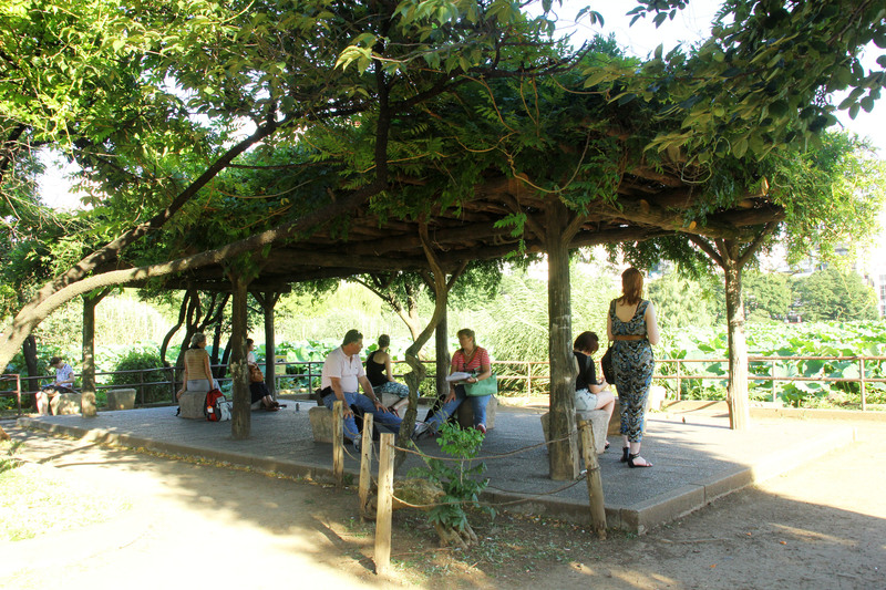 三つの池の中心にある弁天堂の横の藤棚の下は涼みながら蓮池を眺める人で混雑しておりますが、とてもお勧めです。空いてたら是非座ってみてください。