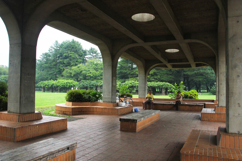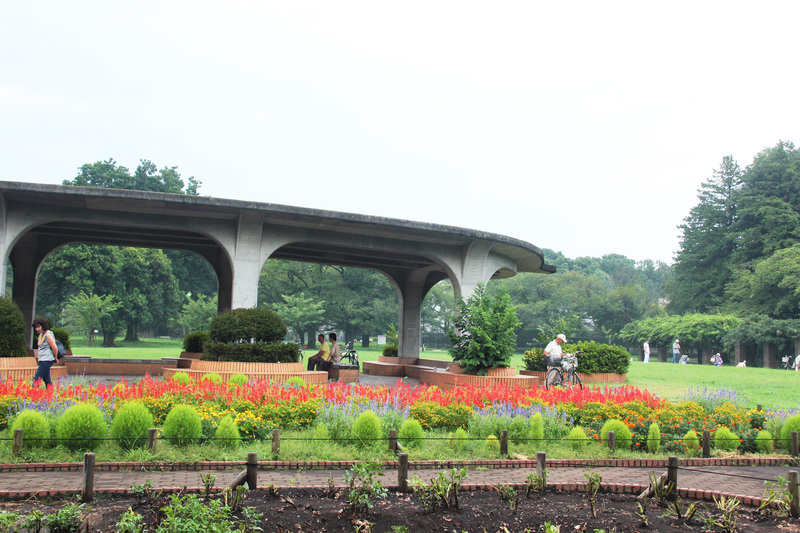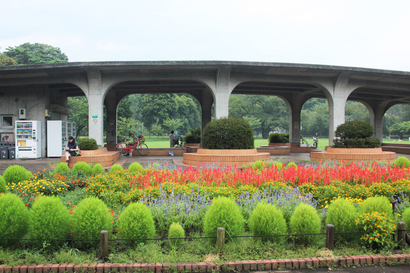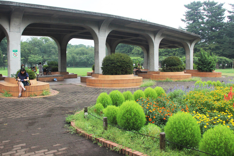 花壇に多彩な花が咲いていて、近くのおしゃれな東屋でお花見を楽しむ人やのんびり休む人などが沢山います。屋根が日差しを遮り、広い芝生広場からも風が吹いて、とても涼しく感じる。